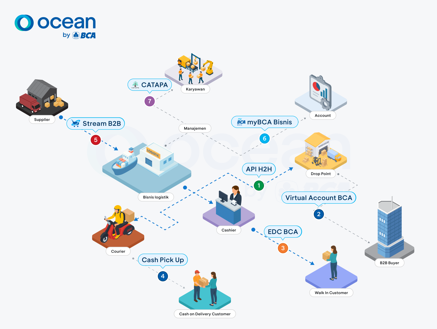 Kami di BCA menawarkan API H2H yang menghubungkan langsung sistem perusahaan Anda dengan layanan perbankan kami secara otomatis dan real-time. Integrasi ini memudahkan sinkronisasi dengan Drop Point/ Distribution Center Management System sehingga operasional dan keuangan bisnis logistik Anda jadi lebih efisien dan terkontrol.